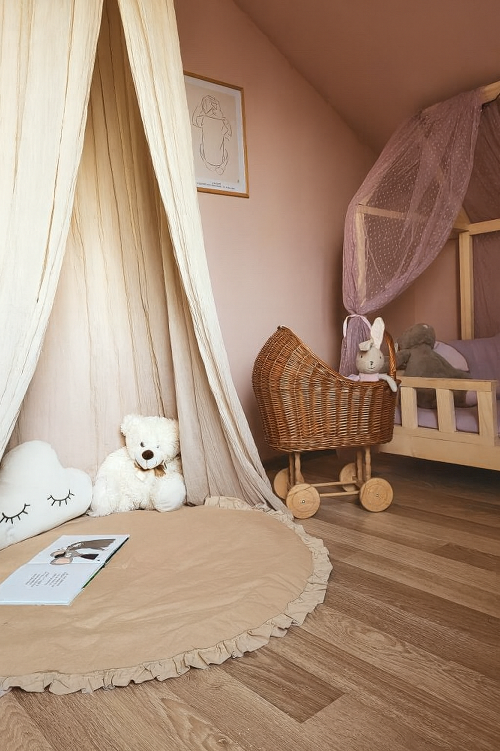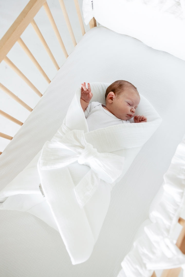 Materijali koje koristimo, kao što je pamučni muslin, su prirodni i nježni, pružaju prozračnost, mekoću i sigurnost za osjetljivu dječju kožu. Muslin setovi 5u1 olakšavaju opremanje krevetića nudeći sve na jednom mjestu: plahtu, prekrivač, jastučić, ogradicu i organizator. Ogradica sa zaštitnim volanima ne samo da štiti, već i oplemenjuje izgled krevetića.