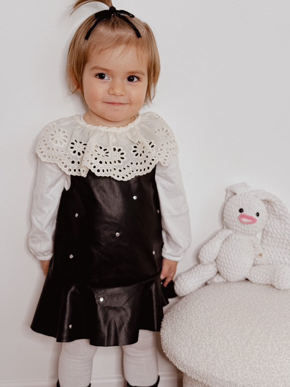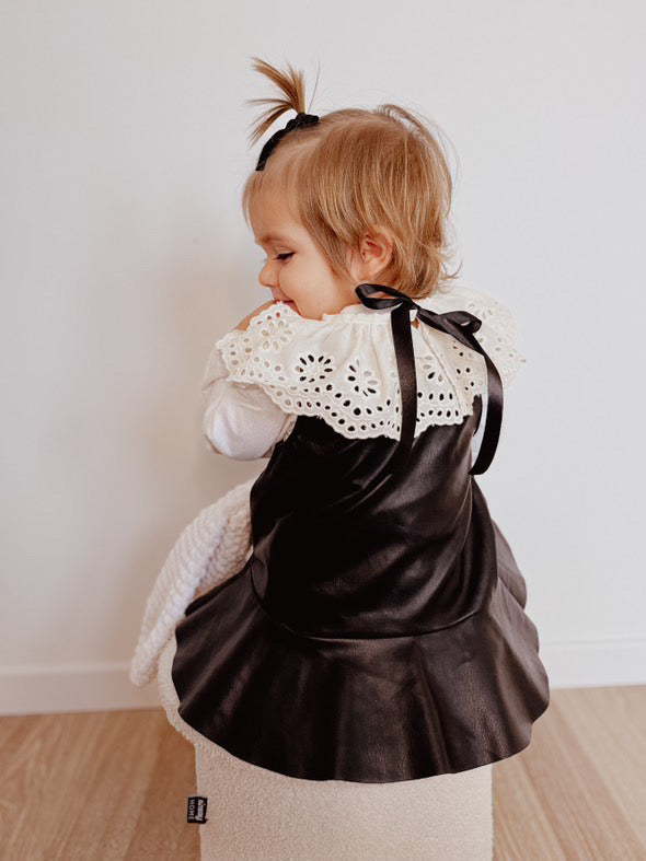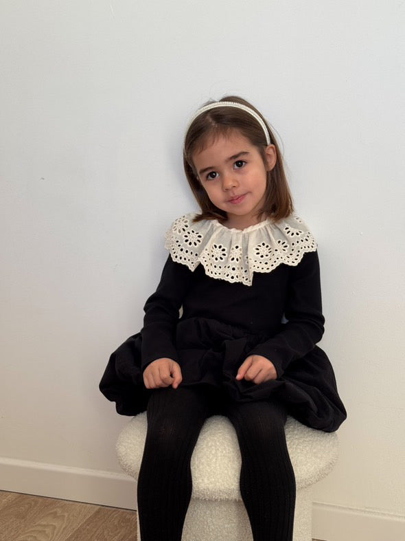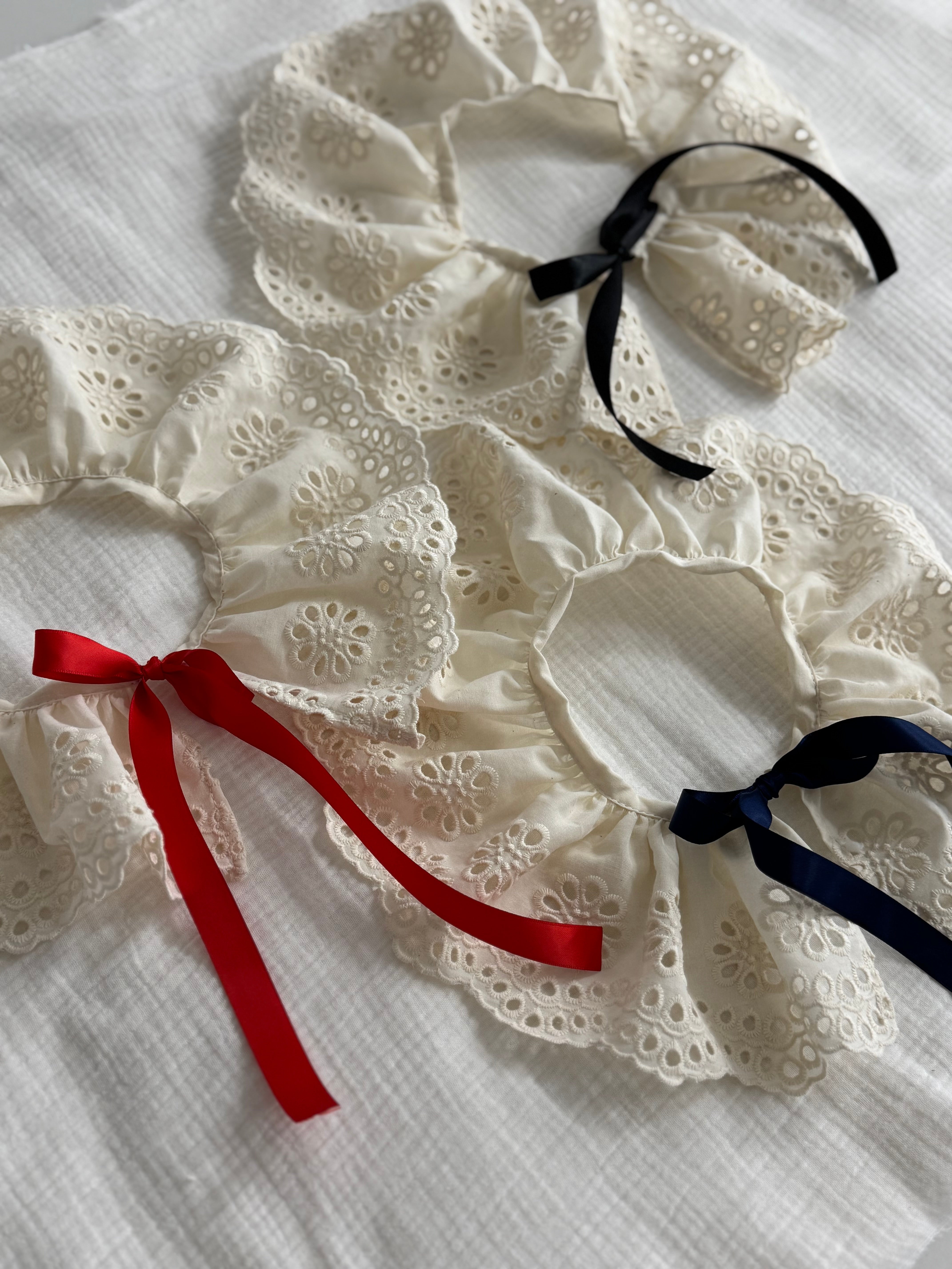 Nježna i udobna pamučna kragnica savršen je dodatak dječjoj odjeći. Izrađena od mekanog, prozračnog pamuka te ukrašena satenskom trakom koja daje poseban, elegantan izgled. Idealna je za posebne prilike, fotografiranja ili kao slatki svakodnevni detalj.