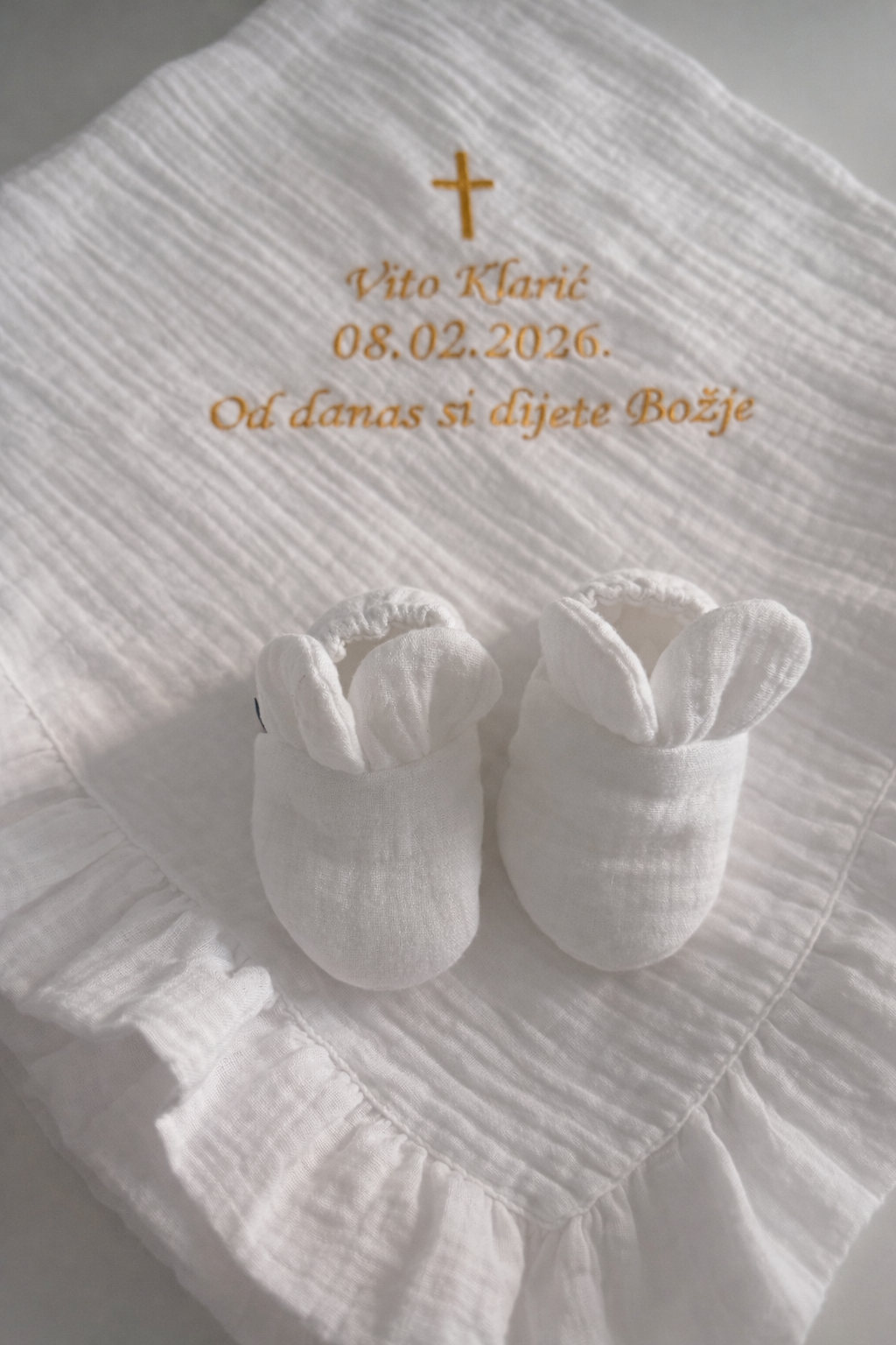 Učinite dan krštenja još posebnijim uz personalizirani set za krštenje koji uključuje 100% pamučni muslin prekrivač (70 × 70 cm) i muslin cipelice. Ovaj set je savršen spoj nježnosti, kvalitete i trajne uspomene.
